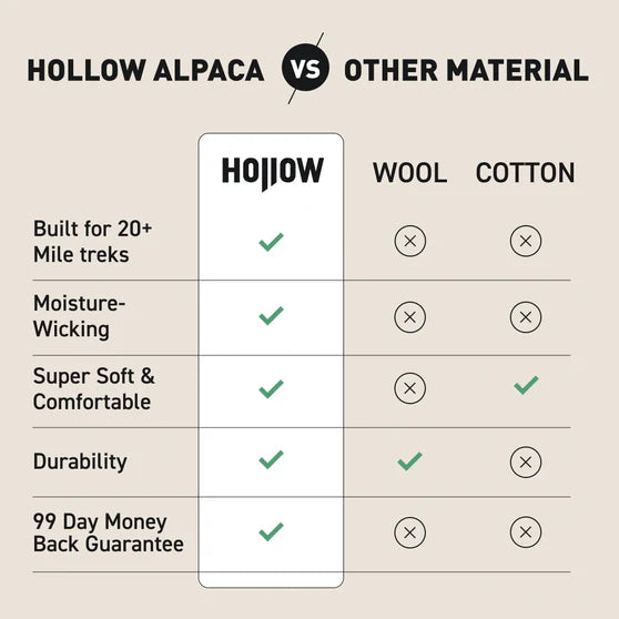 "Hollow Alpaca Socks simply don’t miss. They are warm in the cold, cool in the heat, and unbelievably dry thanks to their naturally hollow alpaca fibers."